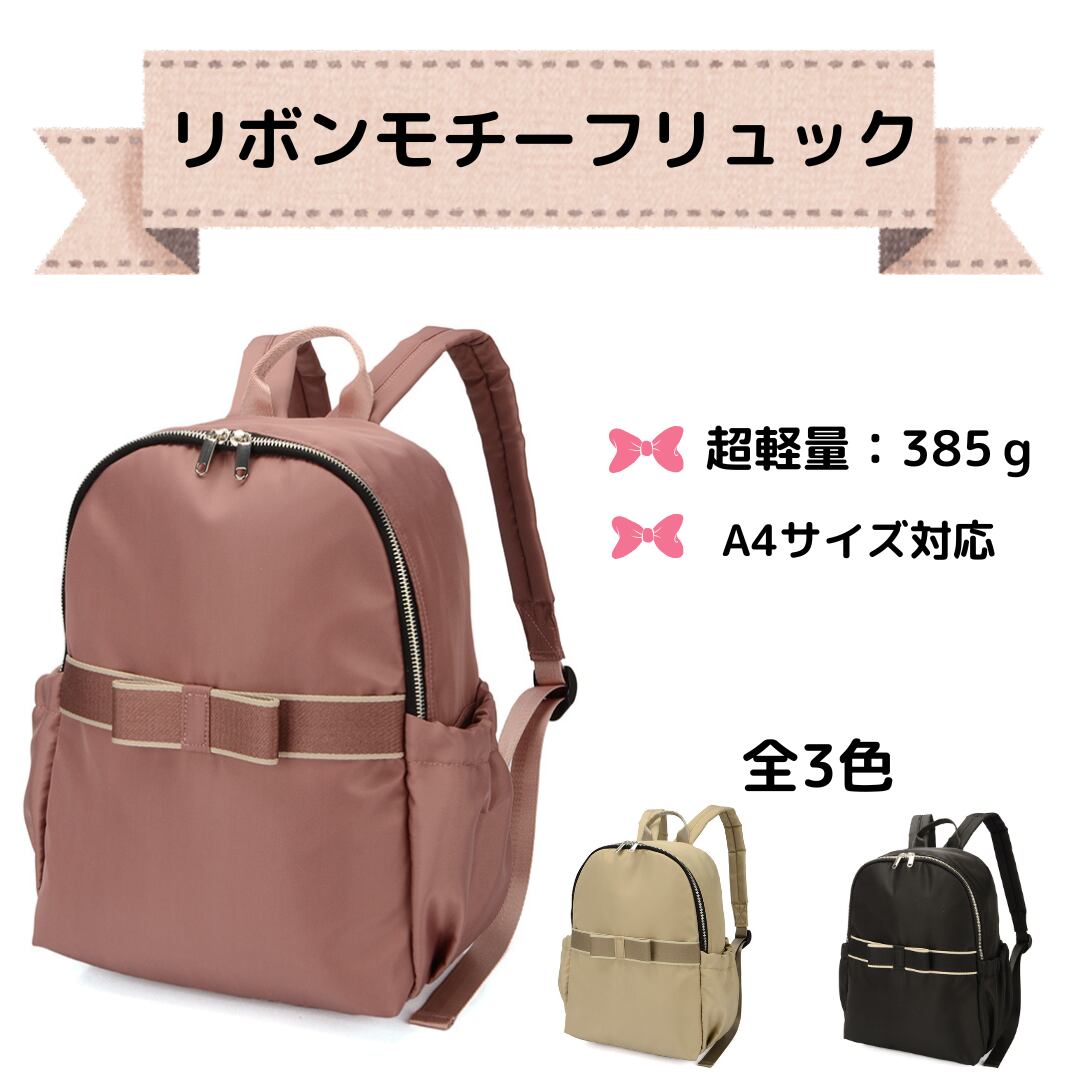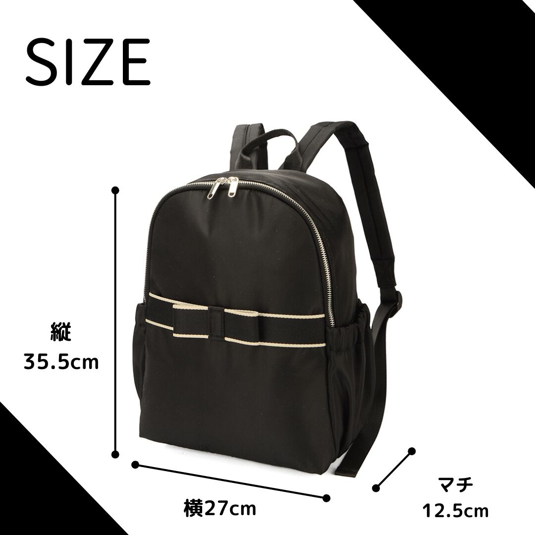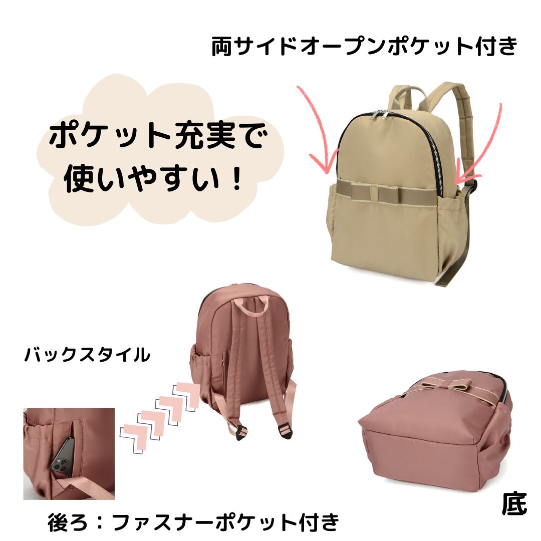 リボンモチーフや、メタルのファスナーディテールが上品で大人っぽいバックパック。