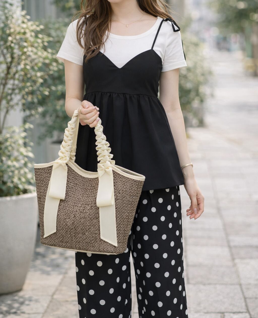 #トートバッグ/#レディースバッグ/#フリルリボンバッグ/#きれい目バッグ/#春夏新作/#レジャーバッグ/#休日コーデ/#お出かけコーデ/#アクセントトート#お出掛けバッグ/#デイリーユース/#高見バッグ/#雑材バッグ/#カゴバッグ/#スタイリッシュ/#涼しげ 編み